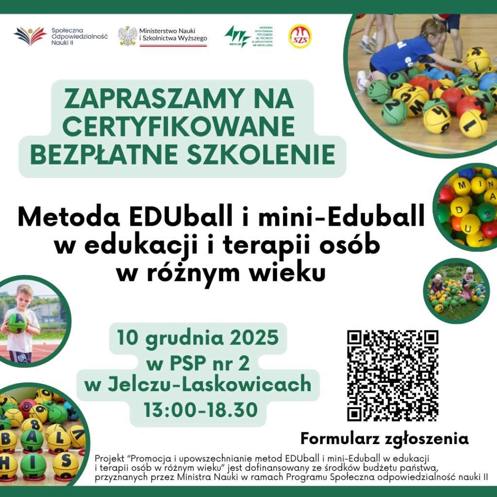 Akademia Wychowania Fizycznego im. Polskich Olimpijczyków we Wrocławiu we współpracy ze Szkolnym Związkiem Sportowym “Dolny Śląsk” zaprasza Państwa na konferencję poświęconą promocji i upowszechnieniu metod EDUball i mini-Eduball w edukacji i terapii osób w różnym wieku.