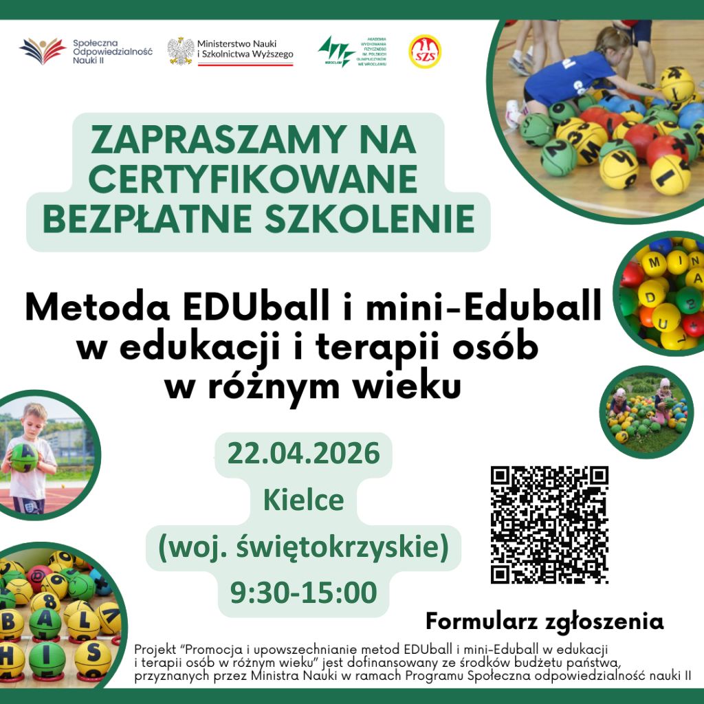 Akademia Wychowania Fizycznego im. Polskich Olimpijczyków we Wrocławiu we współpracy z Wojewódzkim Szkolnym Związekiem Sportowym w Kielcach zaprasza Państwa na konferencję poświęconą promocji i upowszechnieniu metod EDUball i mini-Eduball w edukacji i terapii osób w różnym wieku.